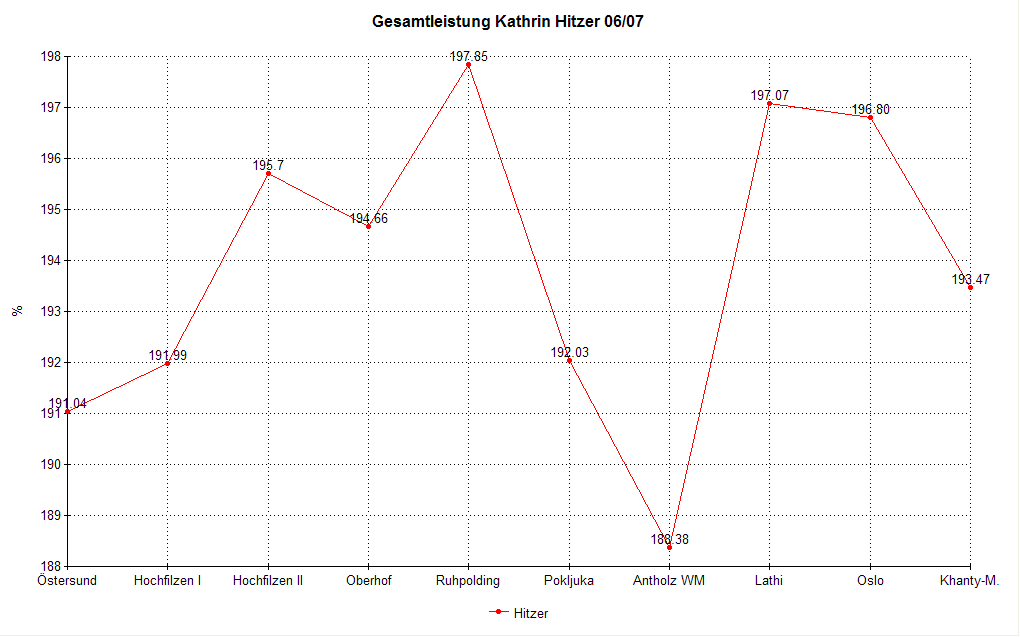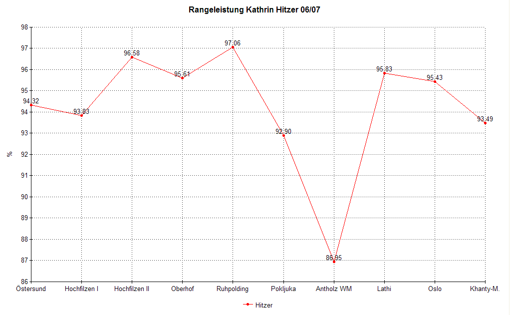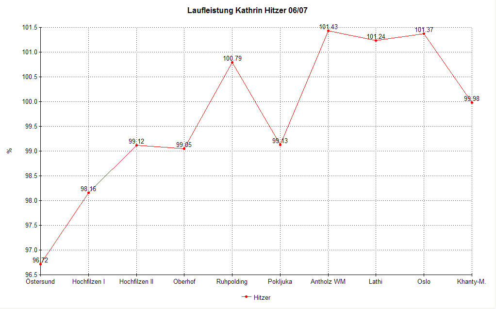 Der Verlauf ihrer Laufform in der Saison 06/07 ist eine absolute Erfolgsgeschichte. Anfangs lag der Index in Östersund noch bei 96,72 %, damit hat man, selbst bei 0 Schießfehler keine Chance auf einen Podestplatz. In der nachfolgende 4 Weltcupwochenden konnte sie sich kontinuierlich und deutlich bis auf 100,79 % steigern. Bevor es in Pokljuka zu einem leichten Formeinbruch kam. Läuferisch stark verbessert zeigte sie sich bei der WM in Lathi und in Oslo. Zum Abschluß in Khanty-Mansiysk konnte sie diesen hohen Level nicht mehr ganz halten.